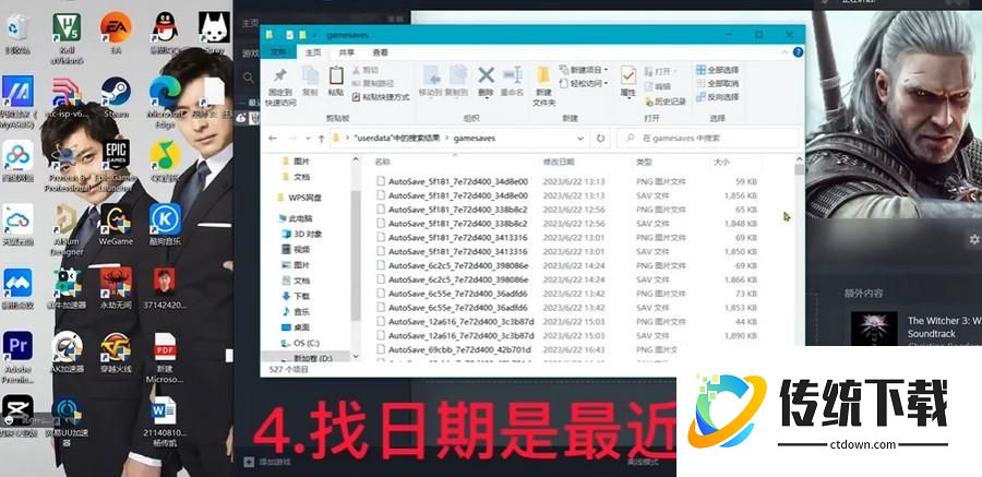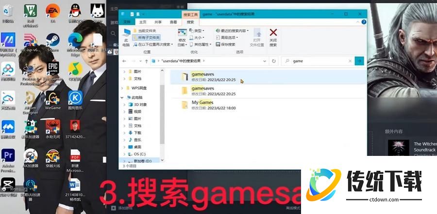 3、搜索“gamesaves”,依次打开同名文件夹,找到里面有文件且最后修改时间距离你【最后一次游玩巫师3最近的时间】相近的文件;