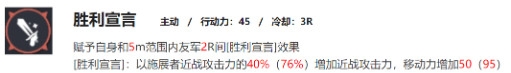 核心技能。开局就放,6级技能,5米范围加以自身近战攻击力60%数值提升队友近战攻击力,与同时给与75移速。