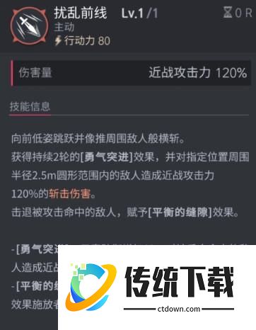 技能目标锁定单体的AOE,跳跃过去,附带击退,不会被反击。当作位移技能。位移距离很远,但不能越过障碍物,技能锁定不到障碍物后面的敌人。