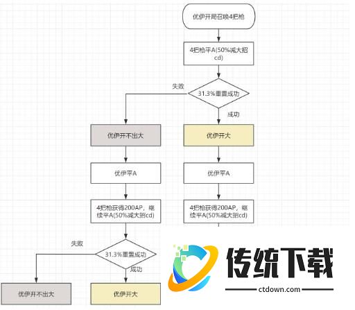 角色机制:每回合可以释放4把召唤物,最多存在4把。召唤物攻击后消耗完全部AP,同时50%几率减优伊大招CD。初始3回合冷却。4把召唤物攻击后相当于31.3%概率重置大招。优伊每回合的第一次平A后为4把召唤物补充200AP,召唤物又能平A4次,减优伊大招CD。又31.3%概率重置大招。