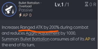 * 召唤物攻击后消耗全部AP,因此如果没有辅助加AP的情况下,除了刚召唤的回合可以开8枪,其余回合只能4枪。