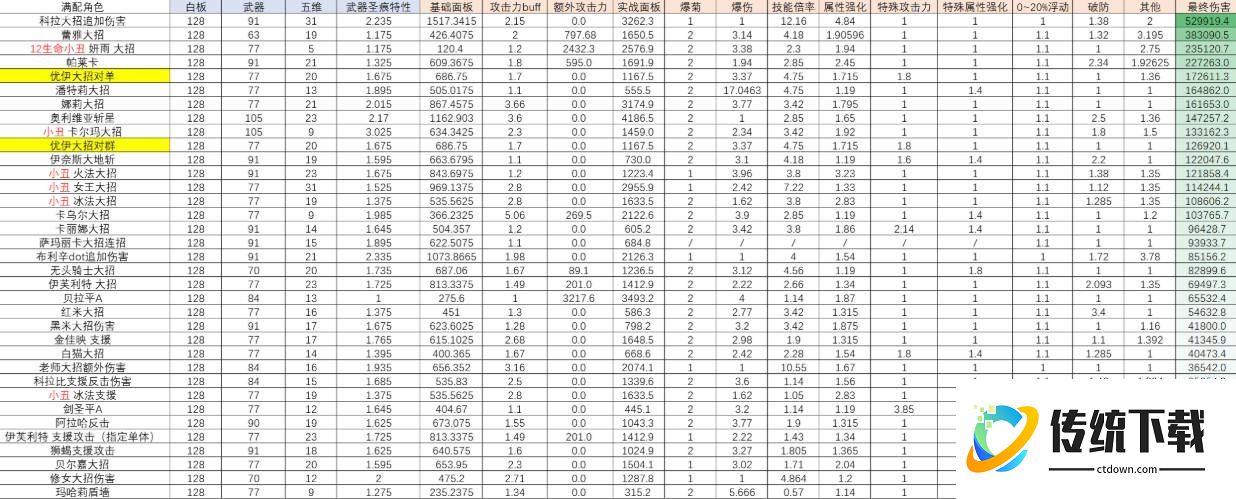 在没有辅助角色的情况下,单次最高伤害排到了第一的位置。主要还是靠多个独立乘区。而且由于是对单体开大,能吃到专武的1.36倍独立乘区效果。如果对群,伤害就少了1.36的独立乘区。
