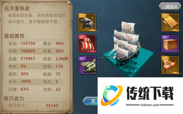2、品质越高的船装,能提供的属性越多。在前期,推荐优先把深海矿石用在火炮上,前期优先提升攻击力,获得的收益还是比堆防御高的。当有一定量的船装积分时,前期优先提升船帆,这样对船速的提升有极大的帮助,不管是喜欢跑商,还是喜欢做活动打港口,船速的提升还是很显著的,其次再升级火炮。