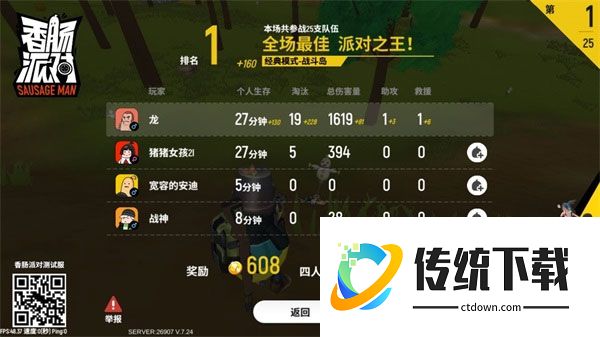 《香肠派对》是一款大逃杀类型的游戏,每一局游戏将有 100 名玩家参与,所有装备全依靠在游戏地图内拾取,最终只有一人存活获得胜利。