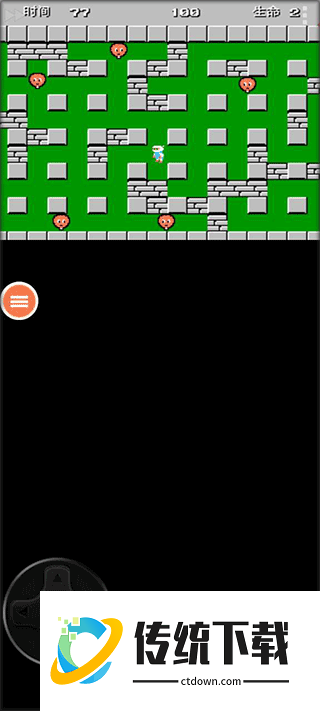 1、下载安装好炸弹人FC手机版,进入游戏通过右边的方向键来控制角色移动。A是放炸弹,B是使用道具。