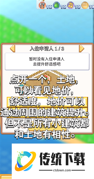 2、接下来可以开发任意几块土地,点击土地可以查地价、舒适度等信息,其中地价可以通过周围的建筑相性得到提升,但是注意不是所有的建筑都和土地有相性