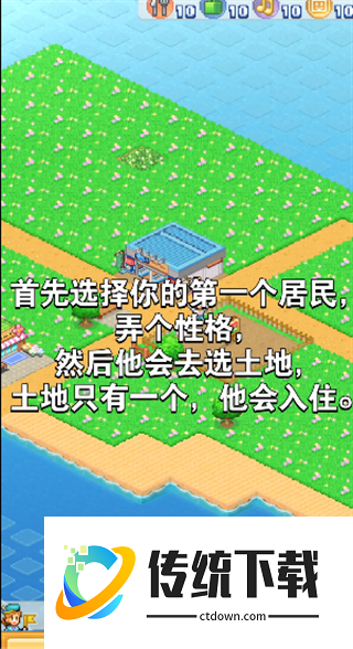 1、首选需要选择你的第一个居民,并选择一种性格,因为初始土地只有一块,所以他会自动选择入住