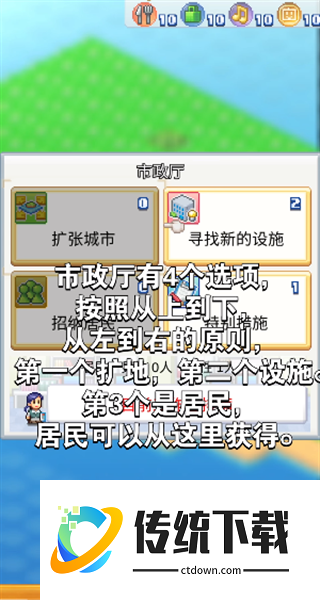 3、市政厅刚刚开始的时候和其他东西都没有相性,可以暂时把它建在角落里,之后可以再移动;市政厅共有四个选项,按照从上到下,从左到右依次是扩地、设施、居民、措施