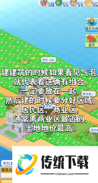 5、建建筑的时候如果看见气泡就代表着这俩有组合,一定要放在一起,建的时候要分好区域居民区,商业区,通常离商业区最近的土地地价最高