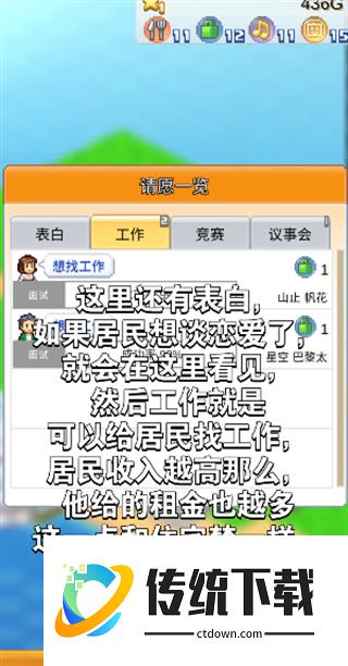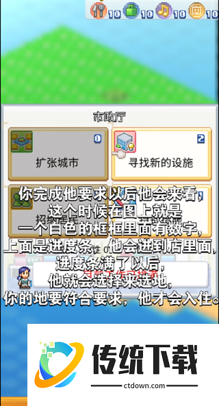 4、其中居民是指居民满意度,完成他的要求后他会来查看,这个时候在图上就是一个白色的框框里面有数字,上面是进度条,当进度条满了以后,他就会选择地区,你的地要符合要求,他才会入住