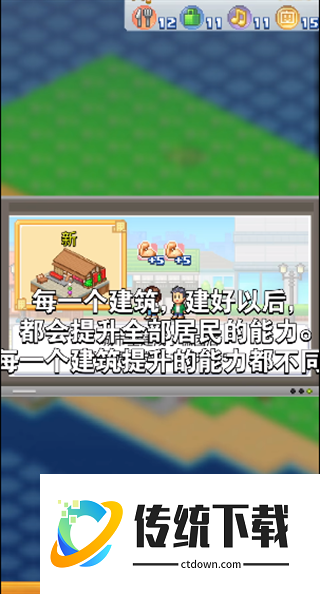6、每一个建筑建好以后都会提升全部居民的能力,每一个建筑提升的能力都不同
