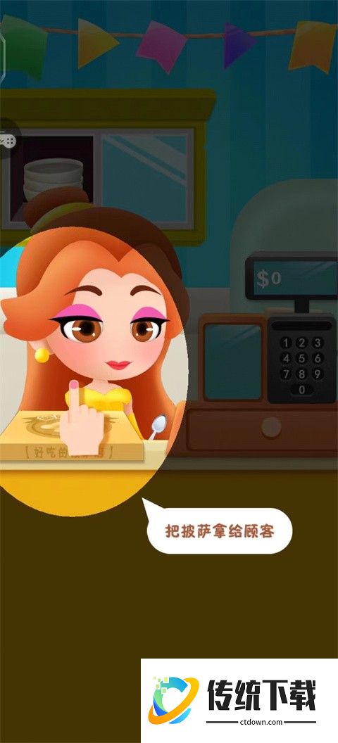 2、画面采用精致的卡通风格,有着披萨和食材的细节,感受视觉的盛宴。