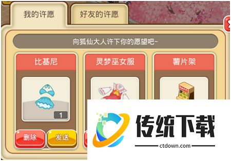 4、祈愿送礼 谨以此献上我最诚挚的爱意古语有“礼尚往来”,虽然说的不是一回事,断个章取个义依然也合乎几分理。礼轻情意在,别人送的和自己买的总归不太一样,就算只是个两毛钱的小摆设,收到后也让人兴奋不已。若是迫不及待想要得到基友的礼物,也可以向狐仙大人祈愿,其他人看到后说不定就会来满足你啦。若是回赠好友的礼物,还可以顺带捎上一封爱意满满的情书,让对方也感受到你的心意哦。