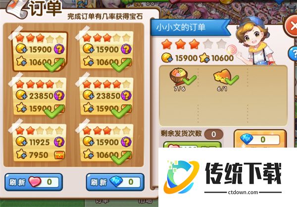 如果镇长们遇到当前订单界面的订单完成实在有难度或者星级都不高,可以刷新订单,每天免费刷新次数是5次喔,比以往版本多增加了4次!超过5次,就需要用爱心或者钻石来刷新了,但是价格也是很亲民的喔。