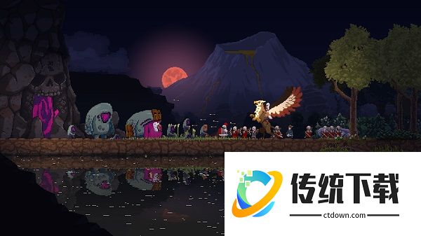 然后准备好一满袋子钱,在黎明刚存完档以后造出炸弹来(存个档防止你翻车),直接一路往山洞平推过去。这时候应该是30天左右,出来的怪都特别弱,就算叠血月也特别弱!根本不用担心。我玩的时候出来的全只有一级小怪。另外你还有一袋子钱加独角兽(狮鹫也可)你怕啥,怪多了你撒钱就行,骑士掉钱了给他补上。但是注意不要冲太猛别让他们打到你炸弹了。就这样一路莽到山洞里吧!山洞里打的时候如果你带的是狮鹫那叫一个爽,不停扇风,小怪根本摸不到你,直接控到死。这一套带走,快乐~