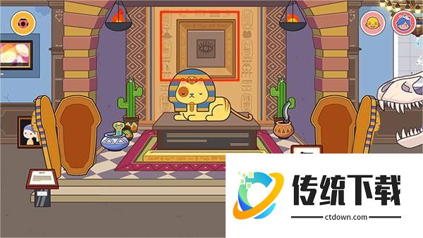 点击狮身人面像上方的“旺旺仙贝”形状图案,即可开启中间的密室,里面藏有埃及法老王套装。