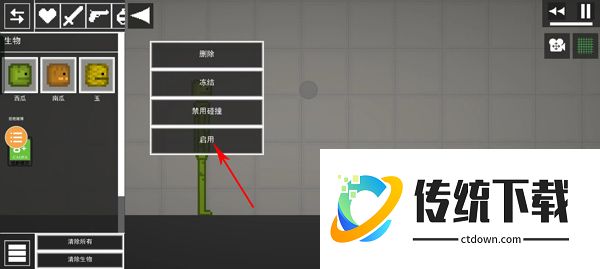 3、然后将胳膊抬起,双击西瓜角色胳膊会出现删除、冻结、静置碰撞、启用,选择冻结,胳膊就会停住;