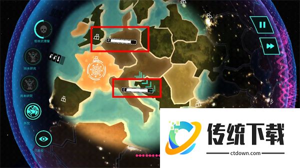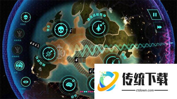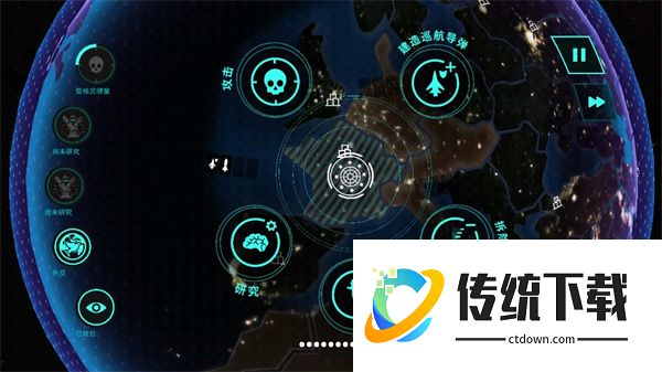 4、放大视图,点击地球上的其余势力,玩家可以选择直接攻击、研究、扩张拆除以及建造导弹等操作;