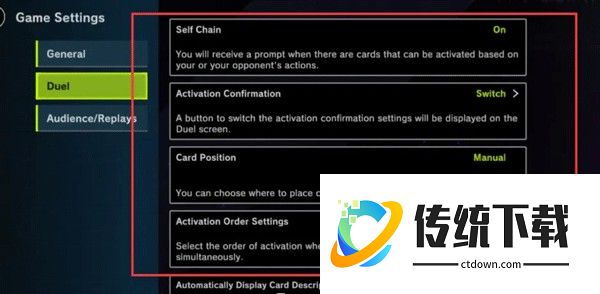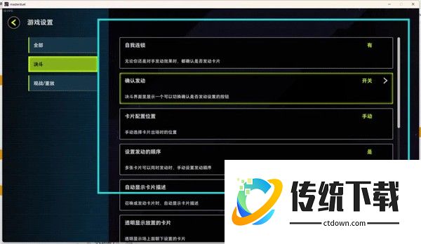 前四个依次为自我连锁,时点开关,卡片位置,选择卡片发动顺序,卡片放置位置,依次设置为开,开关,手动,开