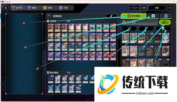 1卡片列表 2收藏列表 3筛选按钮 4排序按钮 5显示拥有/未拥有卡