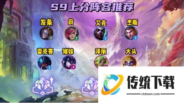 对于想娱乐的玩家来说,前期一定要连败开局,想上分的随意,能连胜开出六皮也是爽局,后期一般都是用泽丽和猪妹收菜没有大头可以换成塞恩,塞纳,因为S9的经济海克斯非常多,正常来说都是上8才开始收菜的,找不到泽丽可以换成厄斐琉斯,同时用寒冰替换雷克赛,没有其他五费卡也可以上个丽桑卓,中期三弗雷尔卓德强度很高,只要不是赌狗阵容基本都可以碾压,收菜以后就更不用担心了,30层以上的“霸王龙”血量就有4000+,就算没伤害也是一个不错的前排,何况伤害还很高。