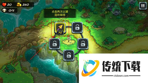 4、进入关卡后,玩家可以点击空地上的棋子进行防御塔建造。
