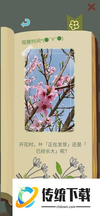 2、点亭子,左边是种子卡片,可以选择观察种子,答题对了得到种子,答题错了给一壶水,中间的书是你所有的收集,右边的铲子是用来种种子的种子卡片答题界面,选择对应答案