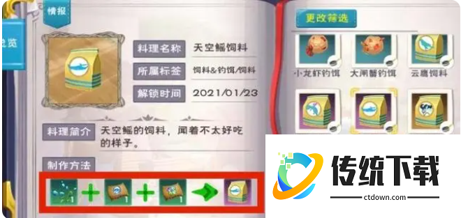 天空鳐的饲料除了购买外,还可以通过烹饪来合成。合成材料为天空果实+符文精华包+四叶草包。