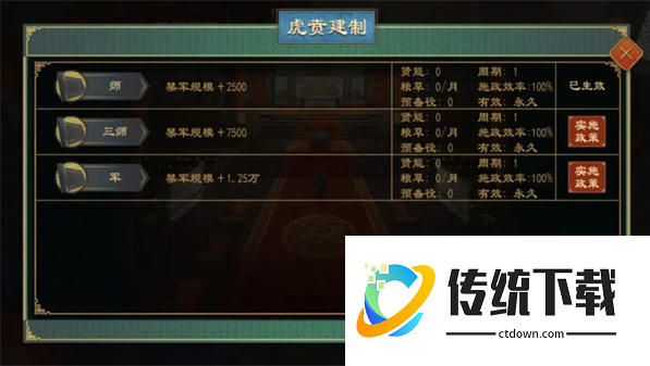 若开启了精简/标准战力系统,则禁军的兵源比例为100%的武勋贵。