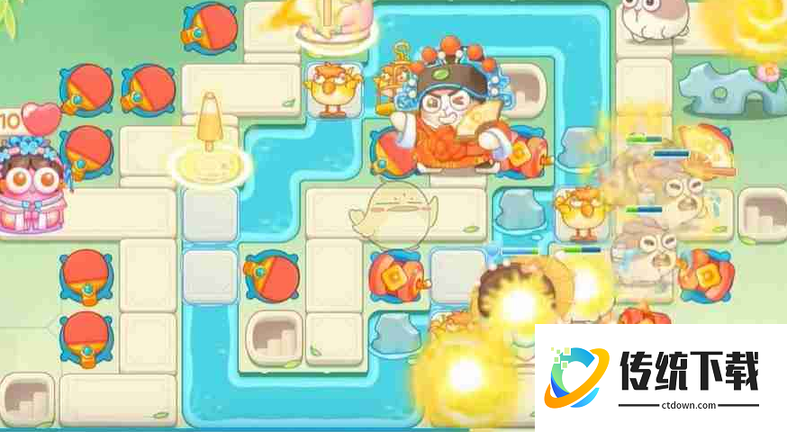 开局策略: 在左上方部署若干个初始炮塔(例如:风扇),优先清理该区域出现的怪物和道具。