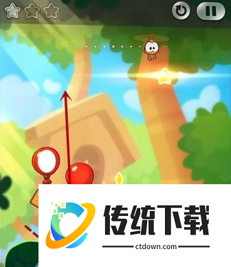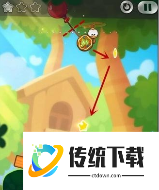 糖果上升后被Roto抓住,戳破气球!看准时间点击Roto使糖果能轻松收集星星并掉进绿色怪物的嘴巴里。