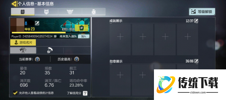 来到基础信息界面,玩家就可以看到自己的KD值了,也就是消灭或者阵亡的情况,当然还有一些次数数据也可以查看得到。