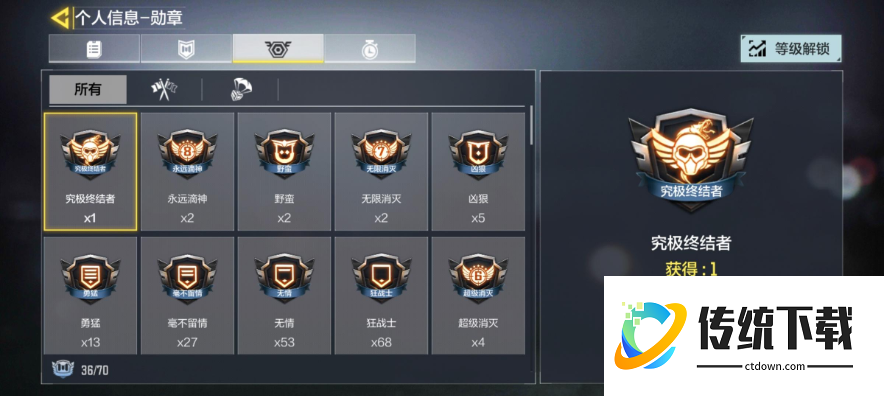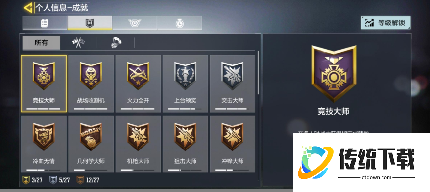 另外还有一个位置是勋章,顾名思义,玩家可以在这里查看到自己所取得的勋章,主要是通过连环射杀或者是特殊射杀等情况所获取的,所以说,勋章是需要玩家通过自己精湛的枪法和战斗一一解锁的哟!