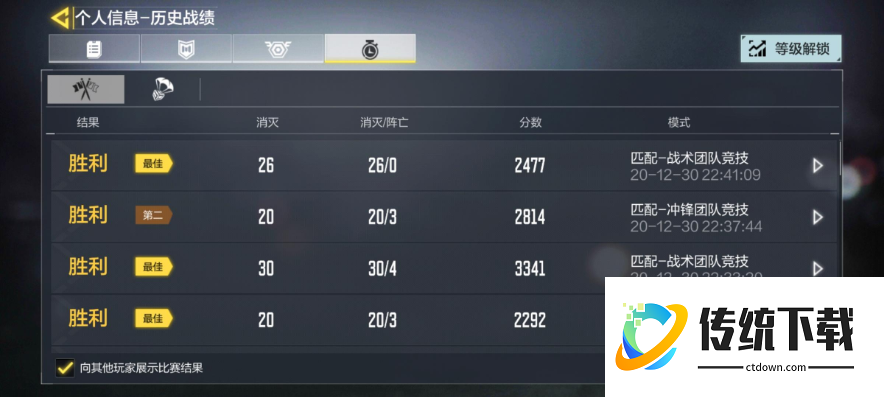 再有就是战绩了,玩家可以查看自己进行的所有战斗的成绩的,得分或者是消灭人数,玩家也可以通过这些总结自己的不足,从而实现更技术的自己。