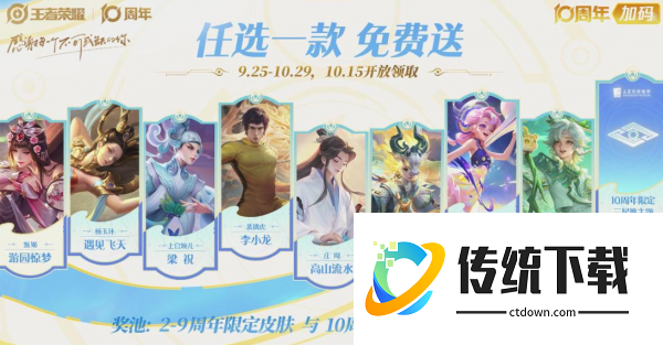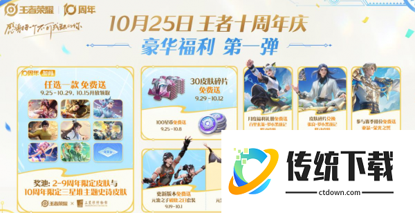 本次庆典将在10月25日正式开启。首波福利中最引人注目的就是史诗限定皮肤免费送。期间参与,就可以从2~9周年的限定皮肤中任选一款,如果之前已收集完毕,还可以免费获得入手十周年史诗限定皮,并且是“三星堆主题”的。