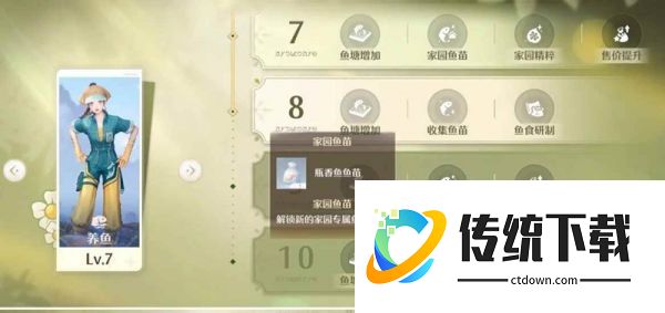 3.升级养鱼9,即59696。养鱼8级开始收集紫色鱼苗,钓纱裙鱼苗,然后刷熟练度拿12kg的成就。养鱼9级解锁瓶香鱼,然后就有材料给蓝色动物做头饰了,做完还能再染色做成就。