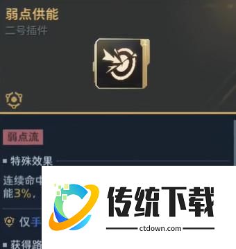 2、二号位【弱点供能】,连续命中敌人弱点三次,每次恢复主动技能3%的充能,一号插件消耗技能给子弹续航,二号插件给技能续航;