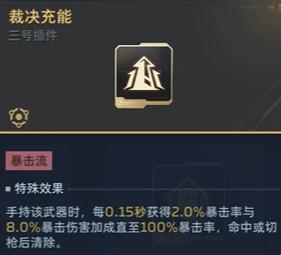 3、三号插件选择裁决充能,可增加暴击率跟暴击伤害,最高可达100%暴击率,每0.15秒就能获得2%的暴击率和8%的暴击伤害输出!