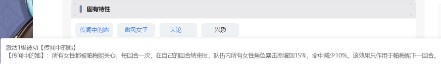 * 如果帕梅妮第一次行动后,下个行动的人是男主、帕梅妮自己、非女性角色。那么这个+15%暴击率,减10%命中就不会生效。然后该角色行动结束,这个+15%暴击率,减10%命中的效果就消失了。该回合就不再触发。
