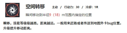 瞬移,技能等级级越高,距离越远。一般用来赶路或者传送到地图外卡bug位置。