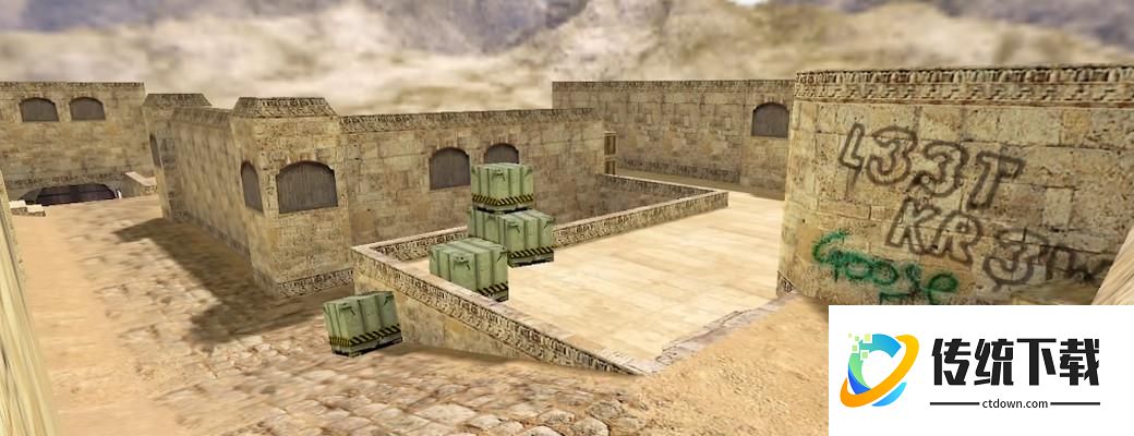 而dust2在创作时,作者得到了V社美术团队的资源支持,将两个包点分别放置在了地图的两端,同时还拉长了T出生点的范围,使得T在进攻时拥有更多的空间路线与选择权。