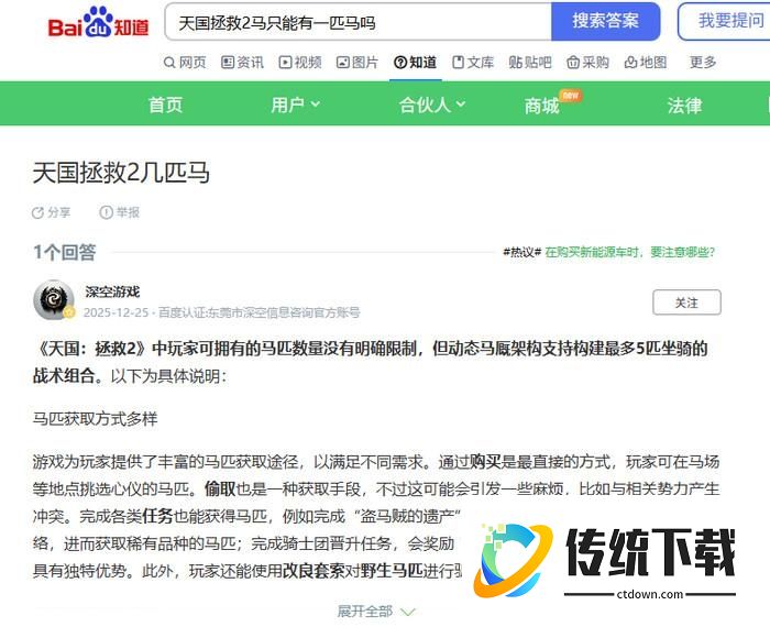 答:天国拯救2同一时间只能拥有一匹马,百度AI和营销号给出的信息是错误的,萌新玩家千万别被误解,所谓的动态马厩机制更是胡编的。