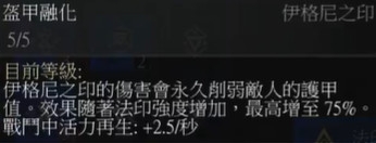 1.盔甲融化:伊格尼之印的伤害会永久削弱敌人的护甲值。效果随着法印强度增加,最高增至75%。