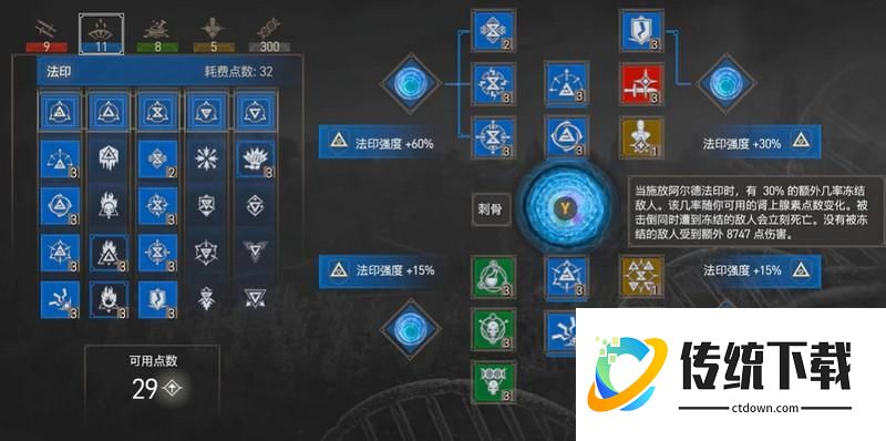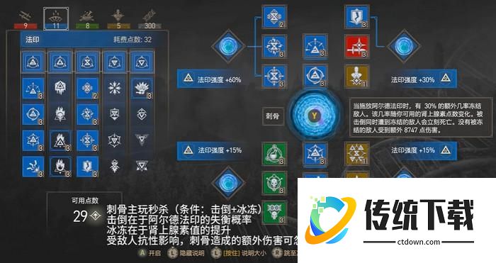 1.刺骨:当施放阿尔德法印时,有30%的额外几率冻结敌人。该几率随你可用的肾上腺素点数变化。被击倒同时遭到冻结的敌人会立刻死亡。没有被冻结的敌人受到额外8747点伤害。