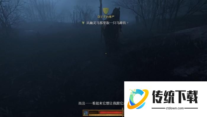 6、跟着幽灵马走,直至它停下,然后靠近马,记住不要 取走马蹄铁;