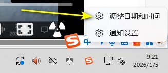 1、在桌面右下角的时间,点击【调整时间与日期】。