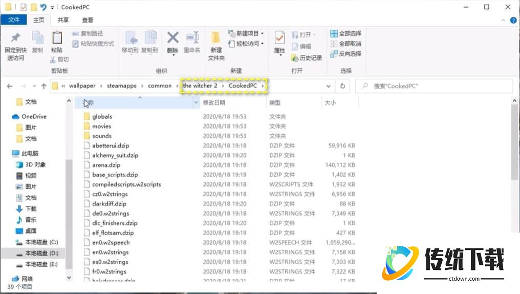 2、找到steam巫师2的游戏根目录,再打开【CookedPC】文件夹(the witcher 2 > CookedPC);