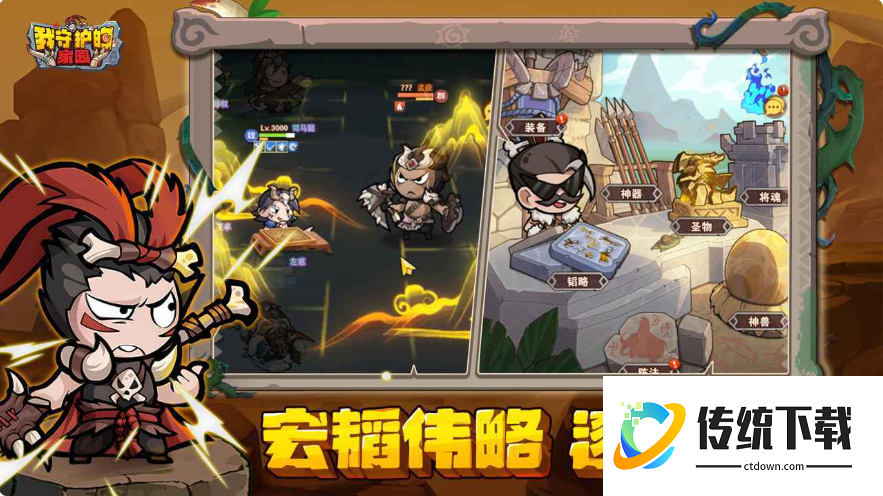 游戏采用全自动战斗模式,不管是推主线、闯副本,还是竞技场 PK,点下 “开始”,你就能悠闲欣赏 Q 萌武将用 “石器版” 技能互殴。