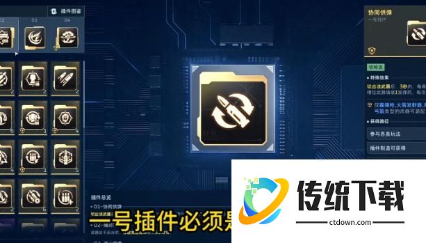 然后咱们看一下副武器的插件搭配,一号插件必须是协同供弹,咱们二、三、四不带都可以,不过,一号插件必须带协同供弹,然后二号的话是随时待命,三号的话带不带都行,四号的话带一个爆破萧条。