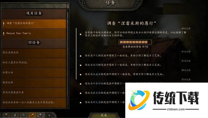 4.4、然后我们沿途经过村庄,看到村庄有感叹号,如果不需要绕路的话,就可以去看看是什么任务,容易做的任务就做一下,配合魅力里面的雄辩术,也能一个任务加二声望,还能改善和村庄要人的关系,增加招兵槽。特别是有白板女儿的版本,可以频繁的去看一下,看能不能找到寻找女儿或者家族世仇,这一类能提供白板NPC的任务。没白板女儿的版本做任务,主要就是为了改善和要人的关系,增加招兵槽,然后顺便赚一点钱和提升声望。